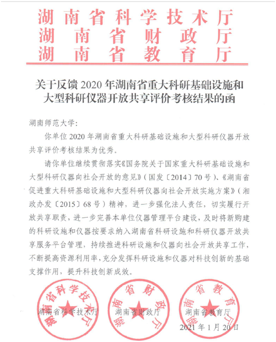 (供稿 资产与实验室管理处)1月20日,省科技厅、财政厅、教育厅联合发布2020年湖南省重大科研基础设施和大型科研仪器开放共享评价考核结果,我校获评优秀。这是湖南省第二年开展评价考核工作,我校已连续两年获评优秀。2020年全省共有35所本科院校参与考核,8所高校获评优秀,3所高校考核不合格。