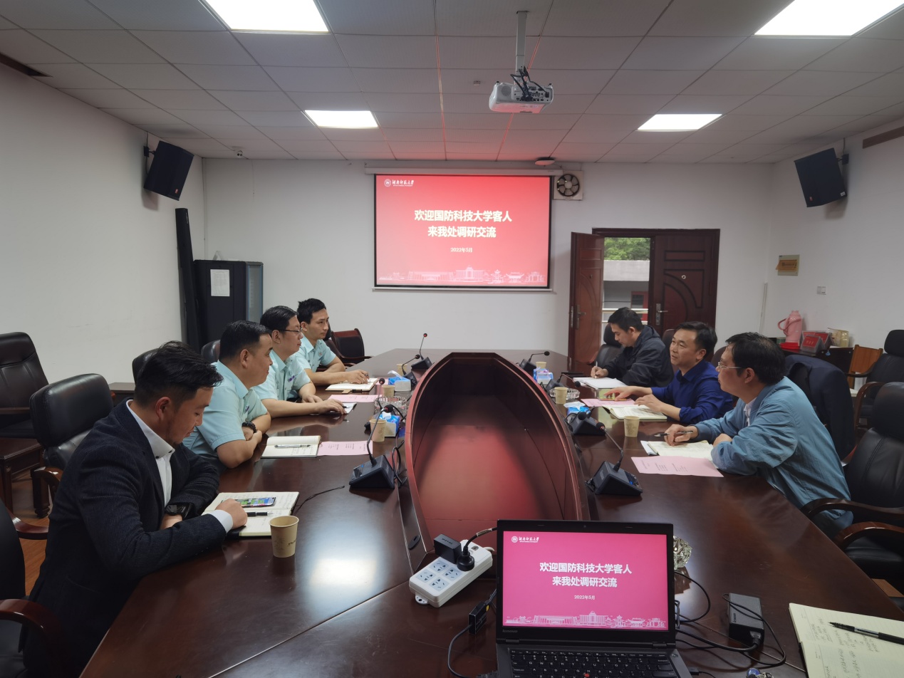 5月19日下午,国防科技大学资产管理监督委员会处长秦磊一行三人来校调研,我处处长向坚持、副处长李江在会议室热情接待并和他们座谈交流。